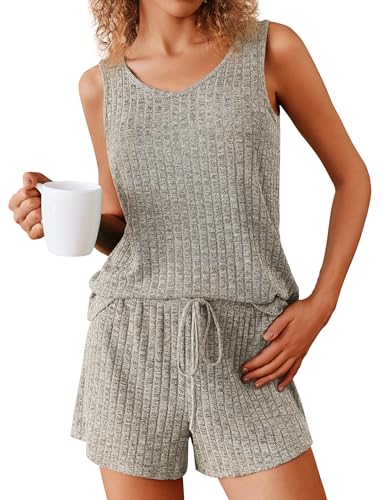 Ekouaer Women’s Pajamas Sleeveless V Neck Pjs Set Ribbed Knit Summer Loungewear Sleepwear S-XXL