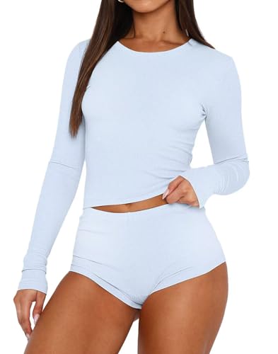 INFITTY Sexy Pajama Set for Women 2 Piece Crew Neck Long Sleeve Pj Soft Top and Shorts Sleepwear Set