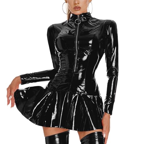Women’s PU Leather Wet Look Latex Leotard Bodysuit Short Sleeve High Cut Thong Zipper Clubwear