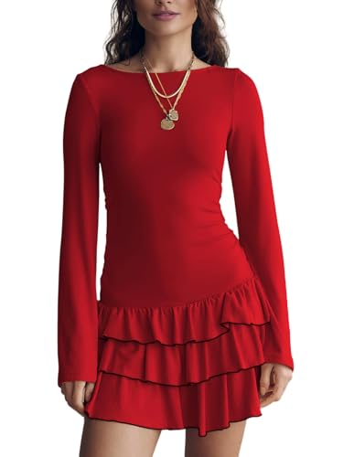 Women’s Crew Neck Ruffle Hem Mini Dress Long Sleeve Bodycon Party Short Dresses