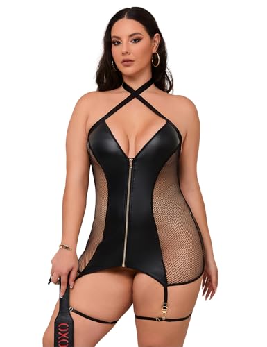 Women’s wet look lingerie set with shiny diamond mesh tight chain backless leather bodysuit