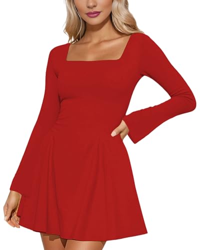 Women’s Mesh Long Sleeve Dress Square Neck Ruched Bodycon Party Cocktail Mini Dress