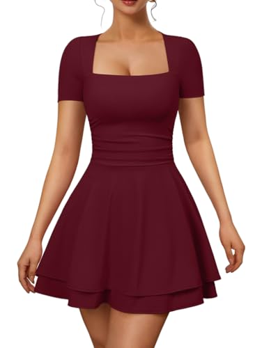 XXTAXN Women’s Sexy Square Neck Short Sleeve Ruched Tiered Ruffle Hem Flowy Club Party Mini Dress