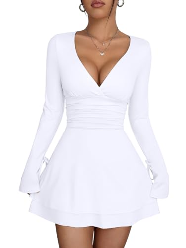 XXTAXN Women’s Sexy Wrap V Neck Long Sleeve Flowy Hem A Line Ruched Waist Corest Mini Dress