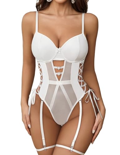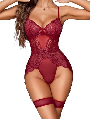 Avidlove Women Sexy Lingerie Lace Bodysuit with Garter Belt & Thigh Straps Mesh Garter Lingerie Set