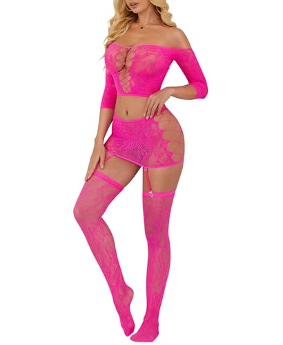 Lilosy Sexy Stocking Underwire Babydoll Lace Mesh Garter Lingerie Set with Panty 4 Piece