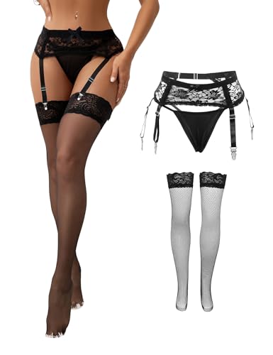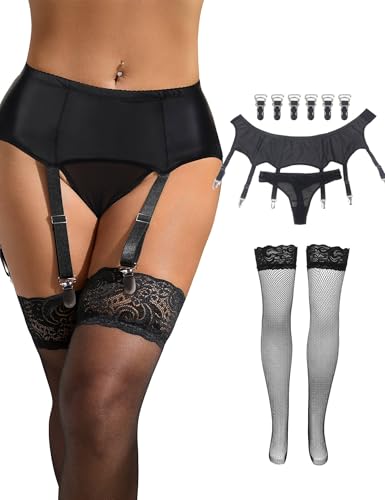 Lace Garter Belt with Metal Clips, Black Mesh Suspender Belt for Thigh Highs, 4 Straps