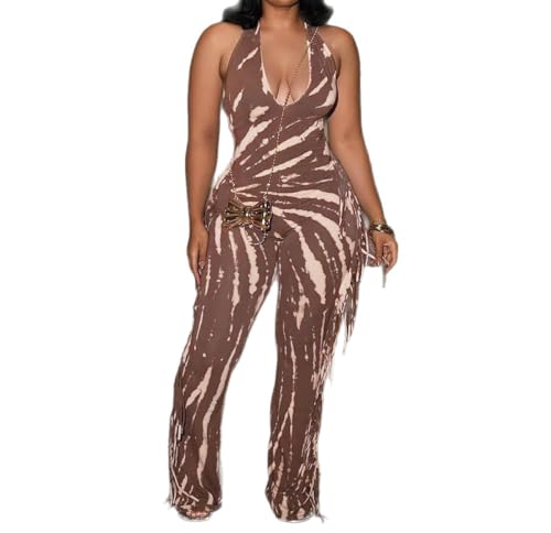 MakeMeChic Women’s Deep V Neck Sleeveless Bodycon Romper Halter Fringe Hem Backless Rompers