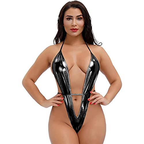 Women’s PU Leather Wet Look Latex Leotard Bodysuit Short Sleeve High Cut Thong Zipper Clubwear