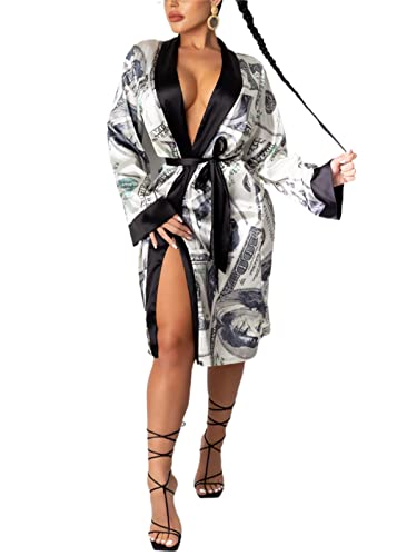 Women Money Print Silky Robes Long Sleeve Dollars Pattern Kimono Satin Robe Pjs Loungewear Sleepwear
