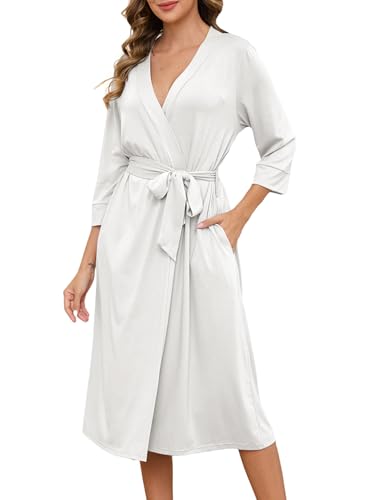 Veseacky Satin Robes for Women Knee Length Bathrobe Lightweight Soft Sleepwear V-neck Casual Ladies Loungewear