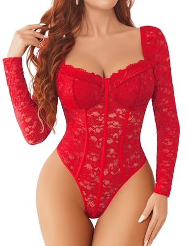 Avidlove Women’s Sexy Lingerie One Piece Bodysuit Floral Lace Teddy Mini Babydoll Wine Red