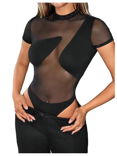 OYOANGLE Women’s Short Sleeve Sheer Bodysuit Mock Neck See Through Body Suit Tops Clubwear