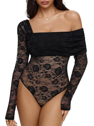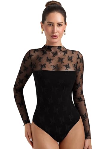 OYOANGLE Women’s Lace Sheer Long Sleeve Corset Bodysuit Sweetheart Neck Party Club Leotard