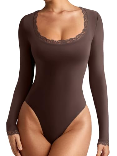 REORIA Women’s Sexy Lace Scoop Neck Long Sleeve Double Lined Layering Slim Bodysuit Tops