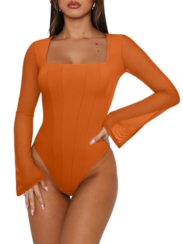 REORIA Women’s Sexy Long Sleeve Square Neck Bodysuit Mesh Double Lined Going Out Tops 2025