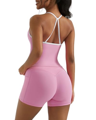 OMKAGI 2 Piece Workout Sets for Women Padded Sports Bra Tank Booty Gym Shorts with Pockets