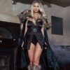 Includes Hooded Romper with Partial Sheer Sleeves, Double Slit Skirt with Sheer Ruffles & Lace-Up Waist Cincher