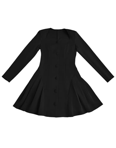 acelyn Womens Sexy Square V Neck Short Wedding Dresses Long Sleeve Button A-Line Pleated Blazer Club Party Mini Dress Black