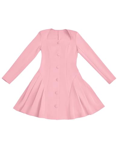 acelyn Womens Sexy Square V Neck Short Wedding Dresses Long Sleeve Button A-Line Pleated Blazer Club Party Mini Dress