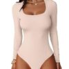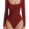 AFITNE Women’s Crew Neck Long Sleeve Bodysuit Basic Trendy Tummy Control Double Lined Thong Body Suit Tops Shirts