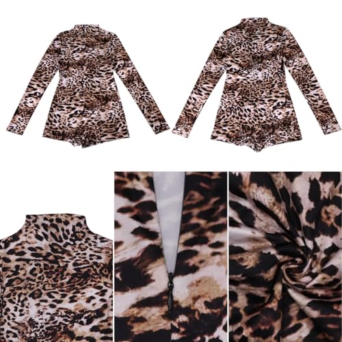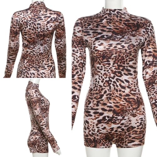 AMPOSSTO Women’s Long Sleeve Leopard Print Jumpsuit – Stretchy Slim-Fit Cat Bodysuit | Sexy O-Neck Romper | Tight One-Piece Outfit for Club & Date Night