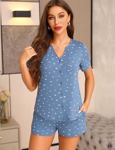 Anjue Pajamas for Women Soft Button Up Pajama Set Short Sleeve Shirt and Pajama Pants Lounge Sets S-XXL