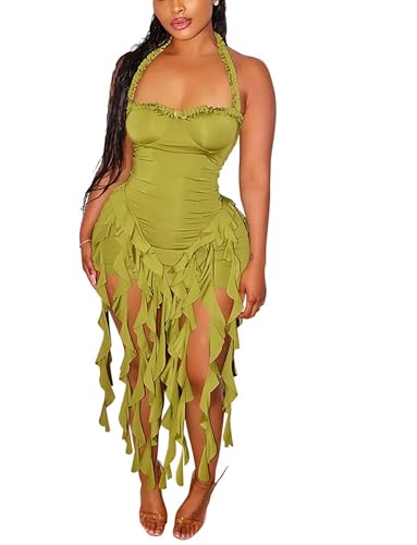 Aro Lora Womens Sexy Halter Neck Sleeveless Ruffle Tassel Party Club Bodycon Mini Dress