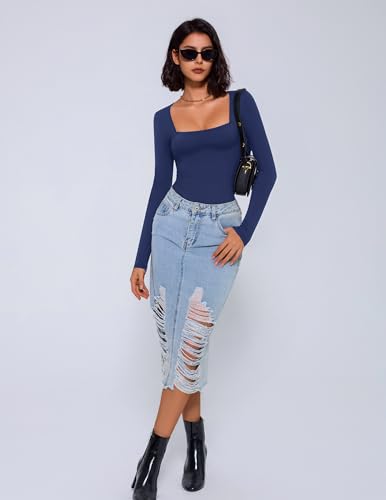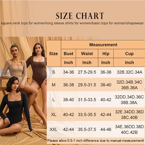 Avidlove Bodysuits for Women Sexy Long Sleeve Bodysuit Square Neck Double Lined Ruched Snap Closure Bodysuit Tops