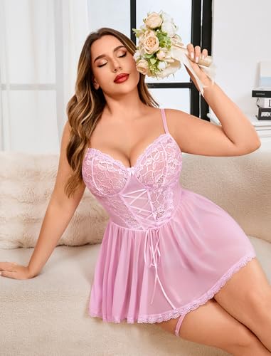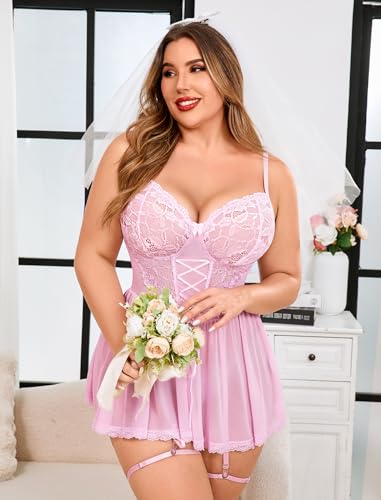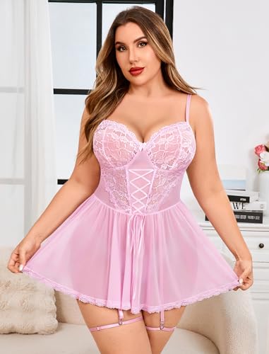 Avidlove Plus Size Lingerie for Women Sexy Lace Babydoll Mesh Chemise Boudoir Nighty with Garter Belt
