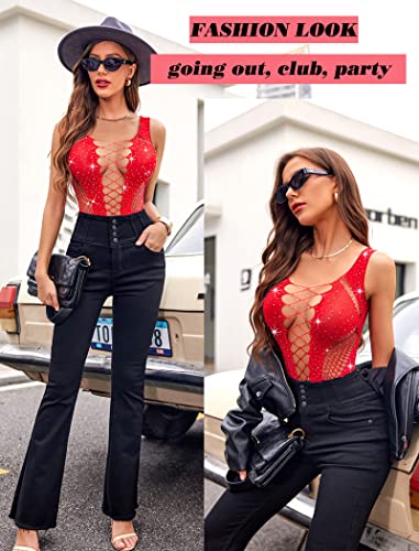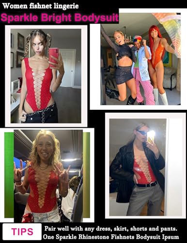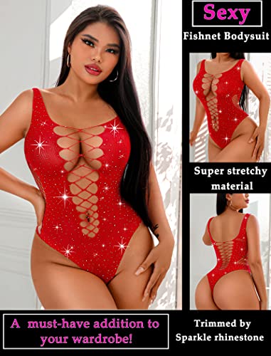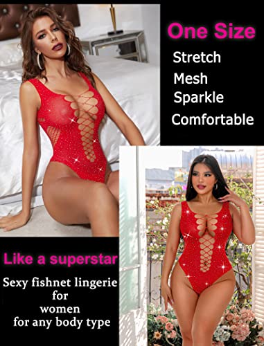 Avidlove Rhinestone Bodysuit Tops Sparkle Fishnet Lingerie Sexy Outfit for Women Mesh Body Suit Teddy Lingeries