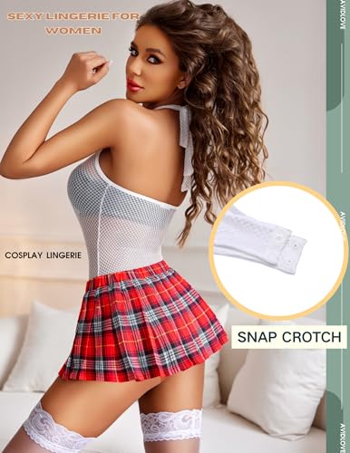 Avidlove Women Schoolgirl Lingerie Sexy Roleplay Lingerie Set Student Snap Crotch Bodysuit and Mini Skirt