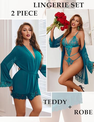 Avidlove Women Sexy Lingerie Set 2 Piece Lace Teddy with Mesh Kimono Robe Bodysuit Nightgown