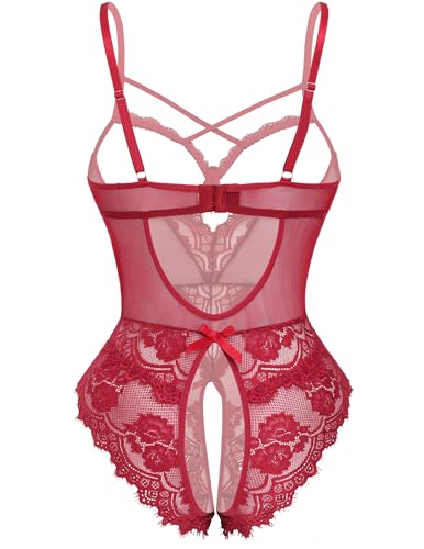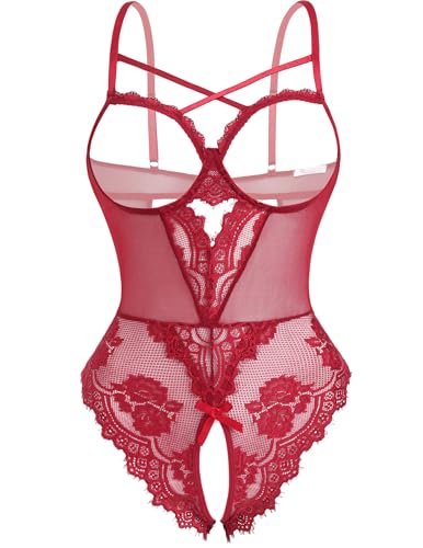 Avidlove Women’s Sexy Lingerie One Piece Bodysuit Floral Lace Teddy Mini Babydoll Wine Red