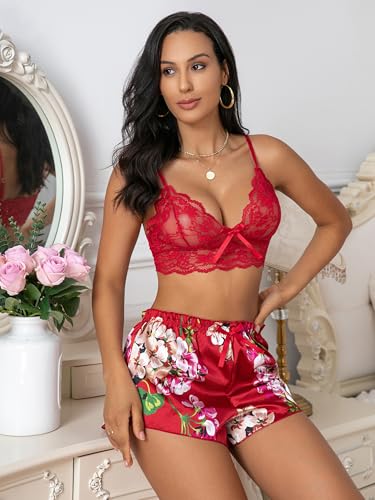 Bow Lingerie For Women Sexy Floral Lingerie Plus Size Lace Bra And Panty Set V Neck Lace Top Cami Shorts S-XXL