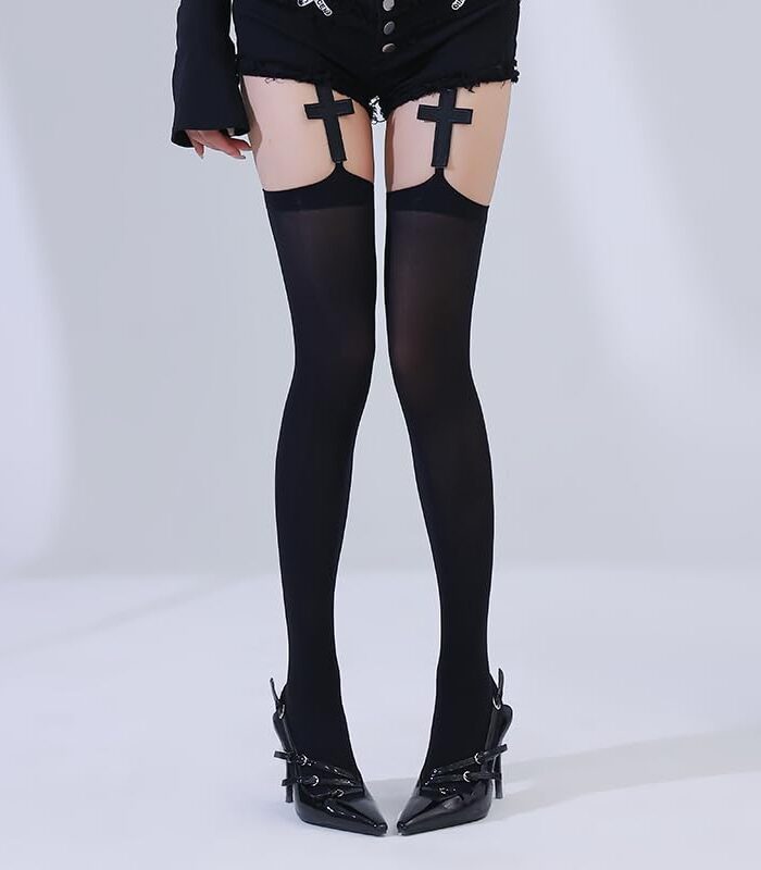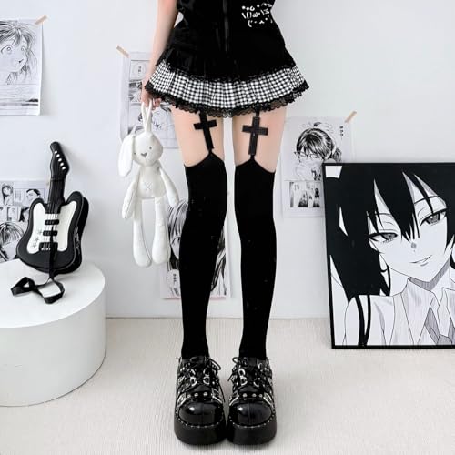CAT KO Suspender Tights for Women Y2K Thigh High Stockings Gothic Cross Suspender Pantyhose