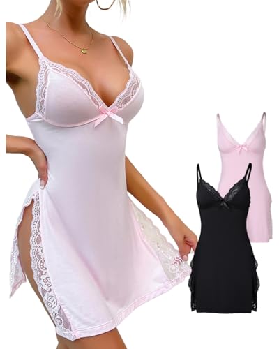 CHICME Women’s Lace Trim Side Slit Modal Cami Sleep Dress Loungewear Cute Night Gowns for Women