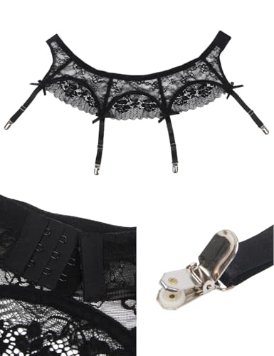 comeondear Lace Garter Belt for Women Plus Size 4 Strap Suspender Belts for Thigh Highs Black Lingerie with Cute Bow