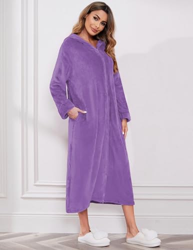 Ekouaer Fleece Robes for Women Hooded Plush Zipper Front Long Bathrobe Warm House Robe Sleepwear with Pockets
