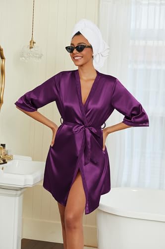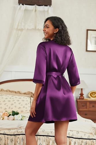 Ekouaer Women Satin Robes for Bride Bridesmaids 3/4 Sleeve Knee Length Silk Bathrobes Lace Loungewear with Pockets