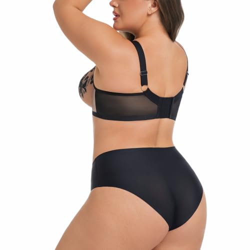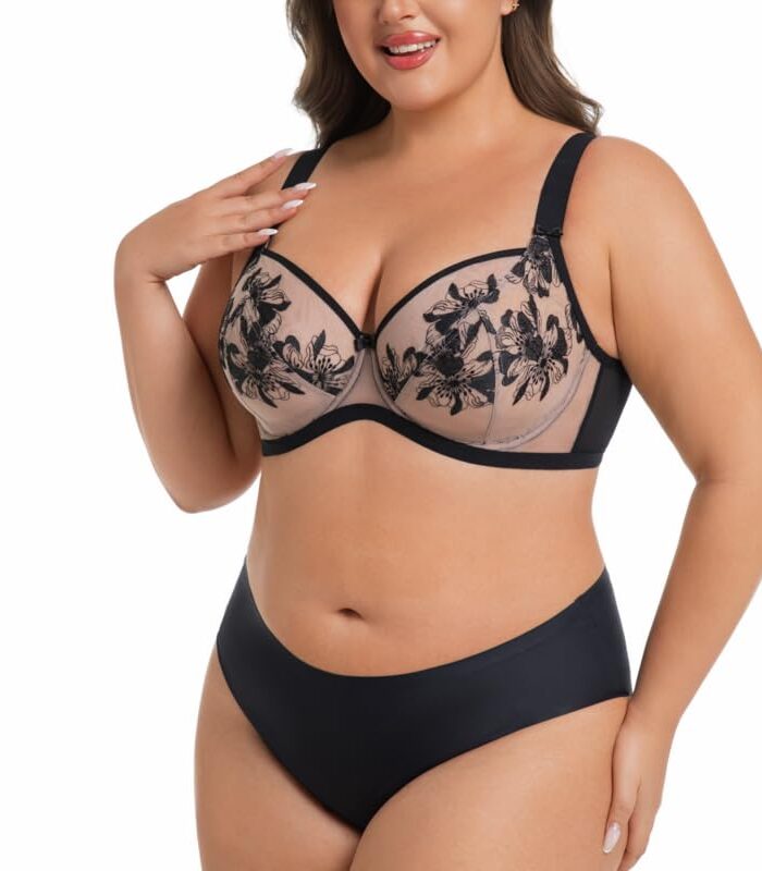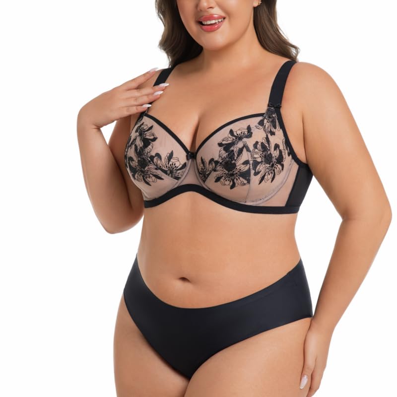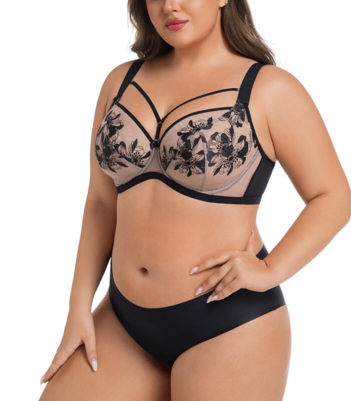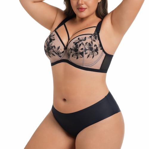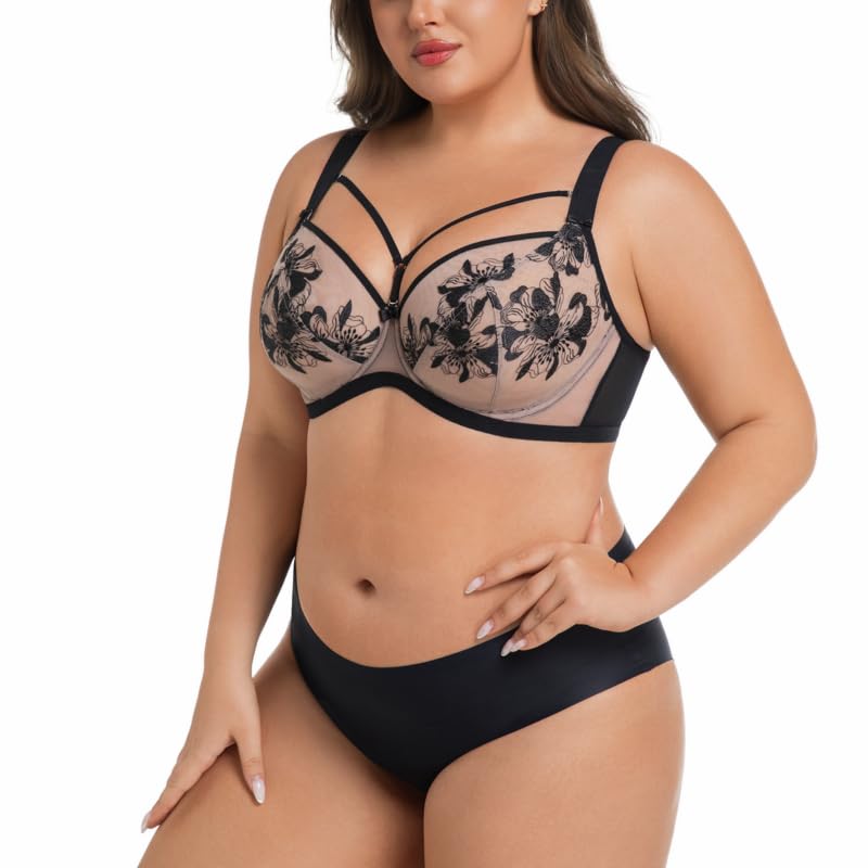 Embroidery Floral Full Cup Underwire Plus Size Bra with Sexy Double Mesh Adjustable Straps Lingerie Black JKLMNO