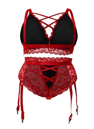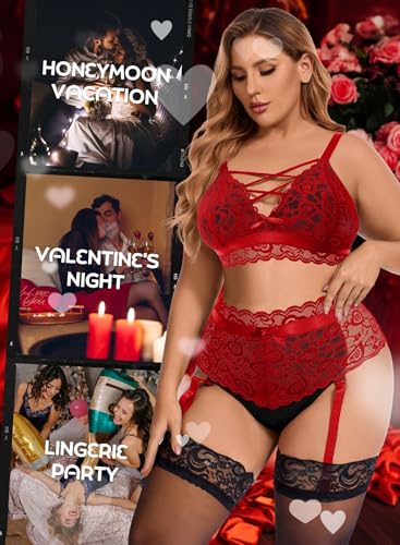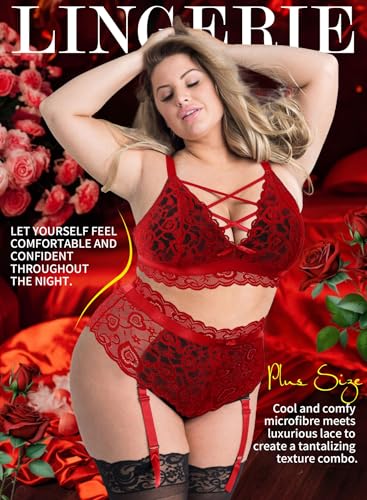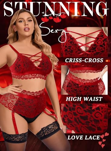 EVELUST Plus Size Lingerie for Women – Sexy Luxe Criss-cross Bra Lace Cup Classic Underwear High Waisted Suspender Set