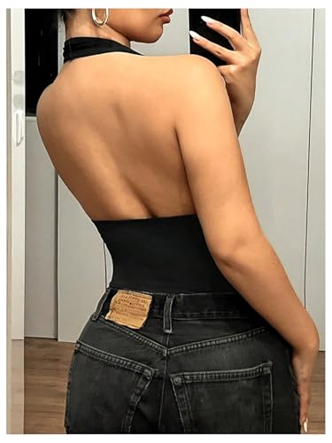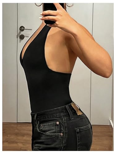 GORGLITTER Women’s Sexy Halter Neck Backless Deep V Bodysuit Open Back Leotard Body Suits Tank Top