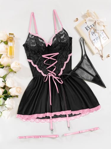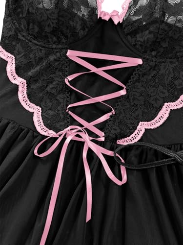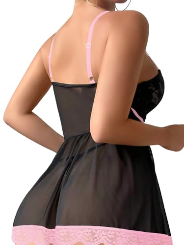Lilosy Plus Size Curvy Sexy Floral Lace Babydoll NightDress Thong Chemise Lingerie Nightwear Underwire Push Up with Women Mesh Sheer Nightgown Slip Plus Size Black and Pink 2# XX-Large
