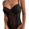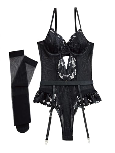 Lilosy Sexy Stocking Lace Mesh Bodysuit Top Underwire Garter Lingerie Set 3 Piece