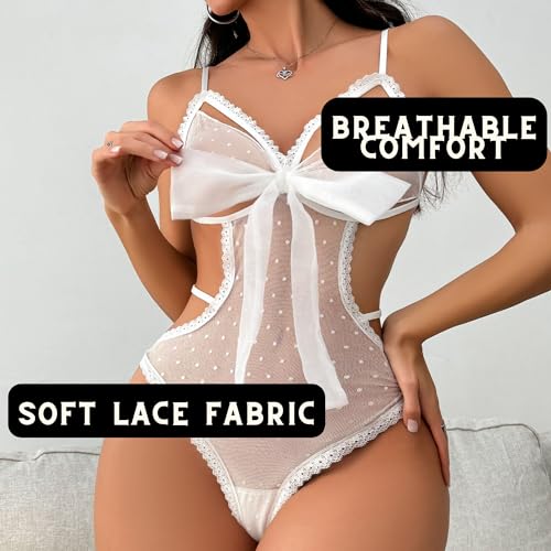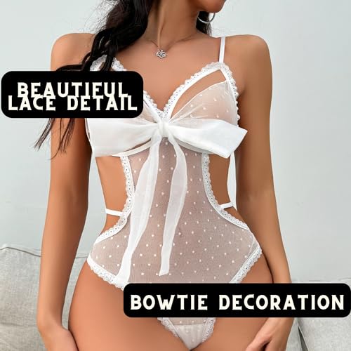 Lingerie for Women Lace Chemise Sleepwear Babydoll Teddy One Piece Bodysuit White with Bow Decoration