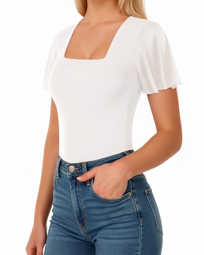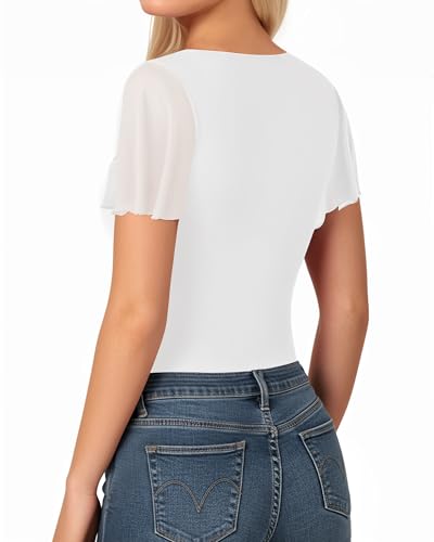 MANGOPOP Women’s Bodysuit Square Neck Ruffle Flutter Sheer Mesh Short Sleeve Slim Fit Blouse Body Suits Tops Casual