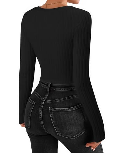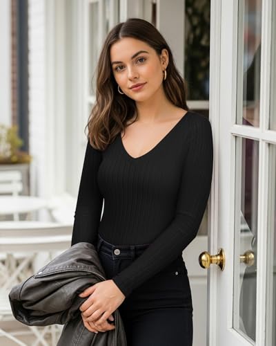 MANGOPOP Women’s V Neck Long Sleeve Bodysuit Sweater Slim Fitted Body Suit Thermal Fleece Ribbed Knit Fall Tops 2025