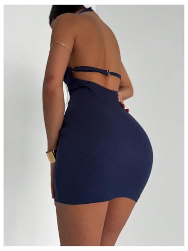 Milumia Women’s Metal Ring Deep V Neck Halter Mini Dress Sexy Blackless Bodycon Party Club Short Dresses