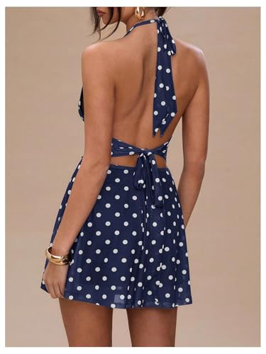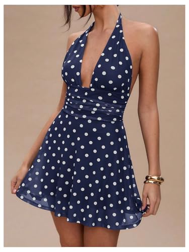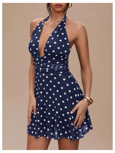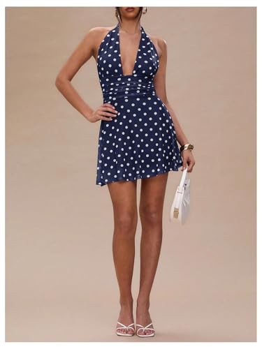 Milumia Women’s Polka Dots Ruched Backless Halter Mini Dress Sexy Deep V Neck A Line Short Dresses